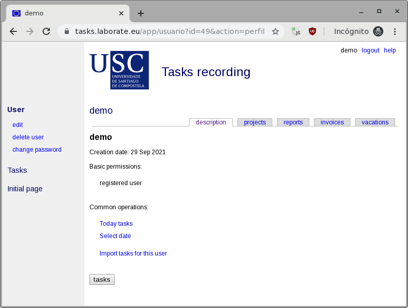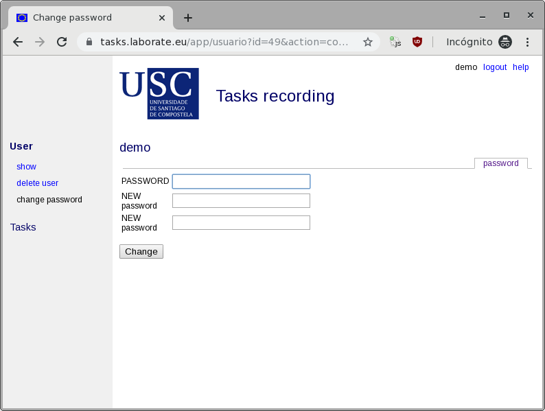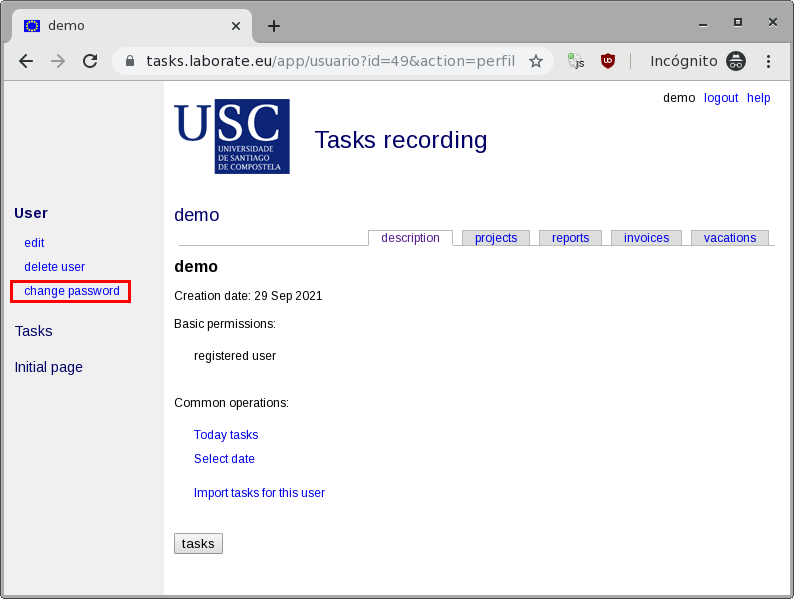 Change passwordAccess the user profile page (if not already there, click on description in the horizontal bar of tabs): ![]() On the left, in the colored area, inside the User block, the command change password appears. Click. The application asks for the current password ONCE and for the new password TWICE. It is not an error. It is common that when updating a password, the programs ask you to enter it twice (and that the password matches) to make sure you know what you are doing and minimize the possibility of a typo. ![]() Press the Change button. If everything was correct the application automatically returns to the profile page. If not, it keeps asking. ![]() |